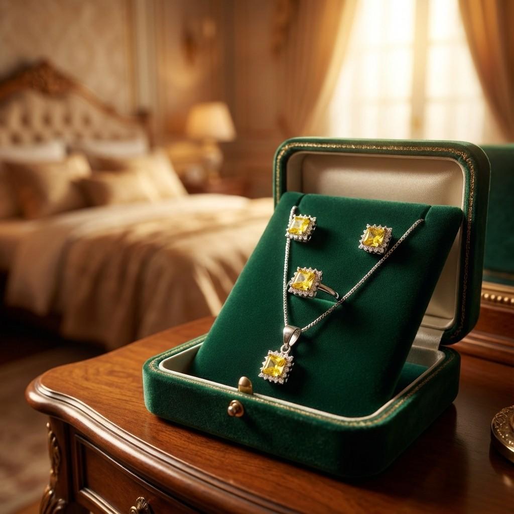 • Centerpiece: Bold, square-cut Canary Yellow gemstones with multi-faceted brilliance.