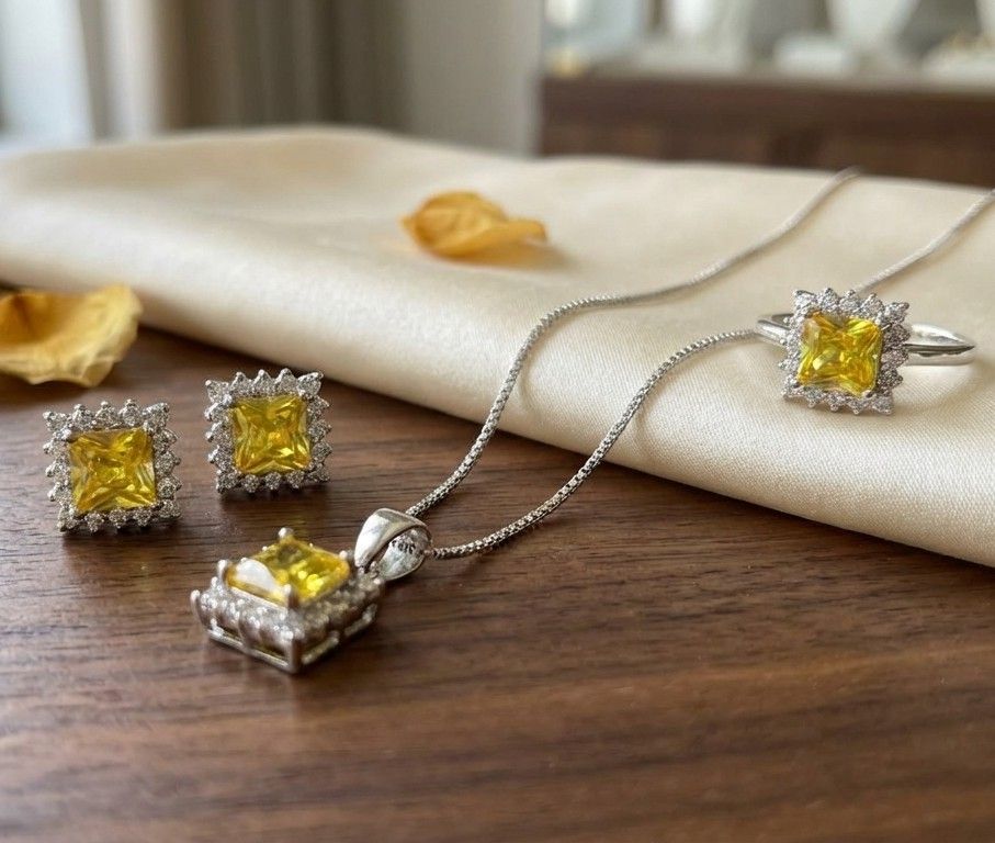 Be the first to review “925 Silver Yellow Zircon Jewelry Set – Yellow Zircon Pendant Necklace, Earrings & Ring”