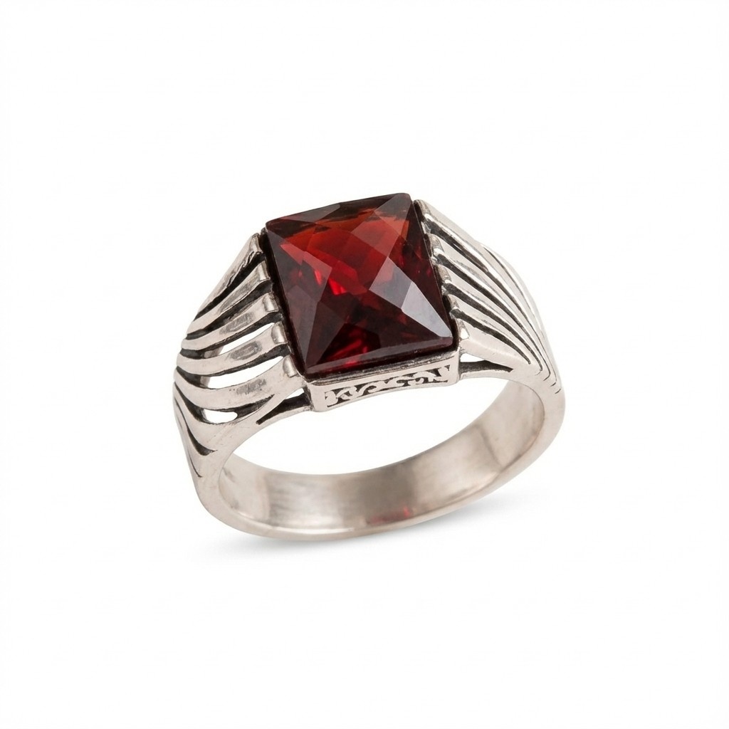 • Exquisite Craftsmanship: Features a bold, square-cut deep red gemstone set in a uniquely designed 925 Sterling Silver frame with artistic open-work details.