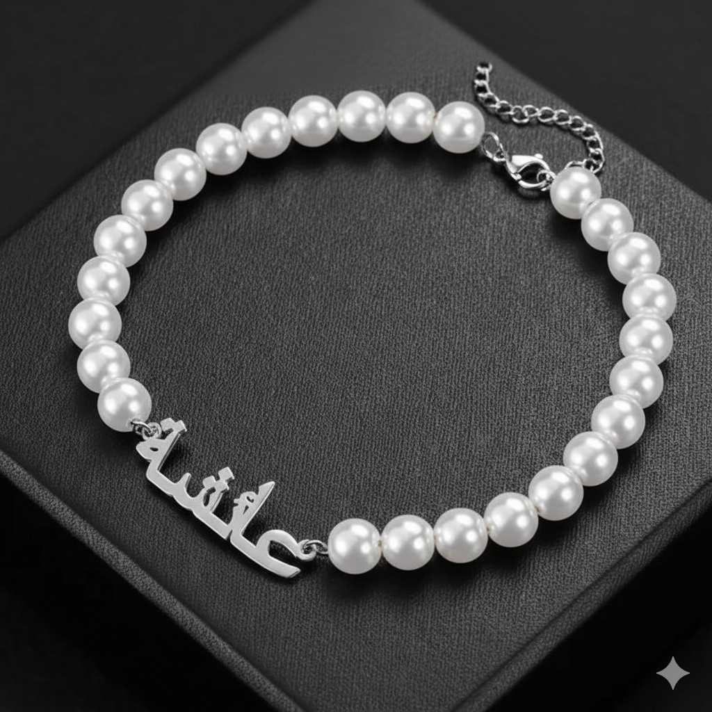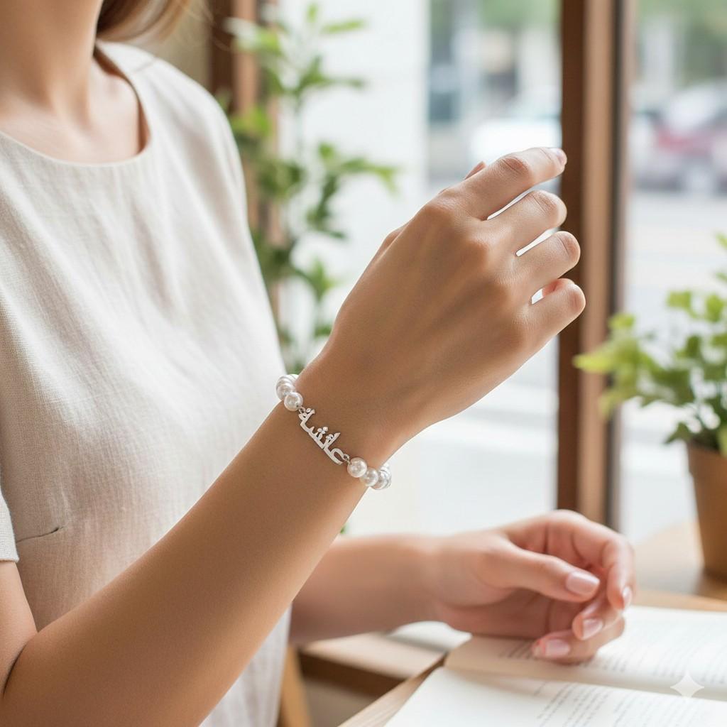 Pearl Name Bracelet for women – Custom Freshwater Arabic & English – Anniversary Gift